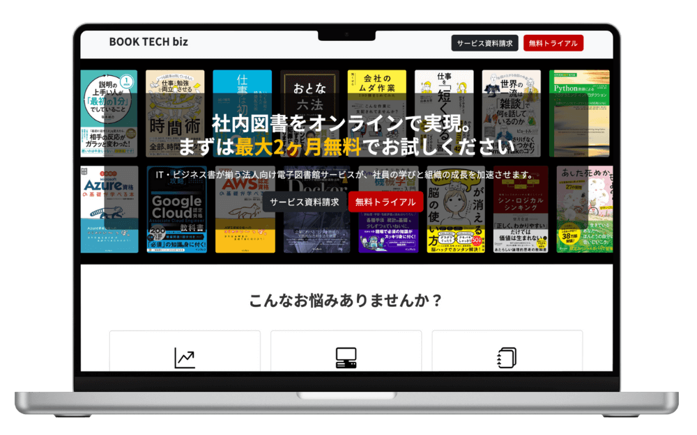 BOOK TECH bizは、法人様が購入した電子書籍を、従業員間で貸し借りできるオンライン上の電子図書館サービスです。